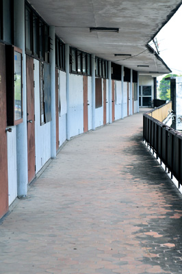 หน้า อาคารอุตสาหกรรม ๒ มีงานศิลปกรรมบนฝาผนังกล่องบันไดโดยอาจารย์ทวี รัชนีกร ศิลปินแห่งชาติและบุคคลสำคัญแห่งเมืองโคราช ปัจจุบันใช้งานอาคารเฉพาะด้านล่าง ชั้นบนปล่อยร้างทรุดโทรม (ภาพ : นิคม บุญญานุสิทธิ์)