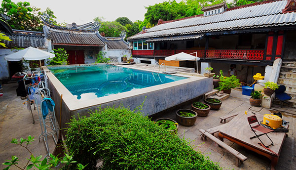 ประตูไม้สีแดงสดตั้งตระหง่าน กำแพงสีขาว-น้ำเงินซ้ายขวาประดับลวดลายจิตรกรรมแบบจีน หลังคาหยึกหยักด้านบนประดับลายปูนปั้นอ่อนช้อย แม้ทุกสิ่งจะเก่าคร่ำคร่าไปบ้างตามกาลเวลา แต่คฤหาสน์โซวเฮงไถ่ยังคงยิ่งใหญ่และงดงามดึงดูดใจ ฉันสาวเท้าเข้าไปในบริเวณบ้าน คาดหวังจะเห็นฉากจีนฮกเกี้ยนโบราณตระการตาอายุมากกว่า200 ปีในไทม์แคปซูล ทว่าส่วนผสมของภาพเบื้องหน้ากลับทำให้ฉันประหลาดใจ สระน้ำทันสมัยขนาดใหญ่ตั้งอยู่กลางลานหินกว้าง เรือนหมู่ 4 ด้านที่ล้อมสระยกพื้นสูงแบบบ้านทรงไทย ใต้ถุนของเรือนฝั่งหนึ่งกักสุนัขสีขาวลายน้ำตาลดำหลายสิบตัว ความลักลั่นย้อนแย้งทำให้คิ้วฉันเลิกสูงถึงกลางหน้าผาก บ้านโบราณที่ดูคล้ายศาลเจ้าแห่งนี้เป็นทั้งสำนักดำน้ำและฟาร์มสุนัขบีเกิ้ล สถานที่ที่เวลาดูเหมือนจะหยุดนิ่ง แท้จริงเต็มไปด้วยมิติทับซ้อนของเวลา