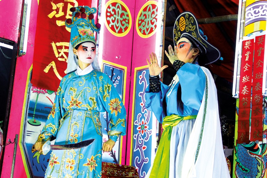 ขณะนักแสดงงิ้วเตรียมตัวก่อนขึ้นเวที แม่ค้าในตลาดสดก็ยังขายของตามปรกติ