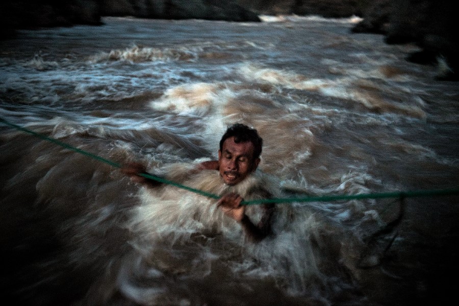 ชาวประมงฝ่าข้ามกระแสน้ำเชี่ยวกรากด้วยการไต่เชือกไปยังหลี่ของเขาซึ่งตั้งอยู่กลางแม่น้ำ เพื่อเก็บปลาแล้วฝ่ากระแสน้ำกลับเข้าฝั่งอีกครั้ง ถ้าเขาพลาดนั้นหมายถึงชีวิต