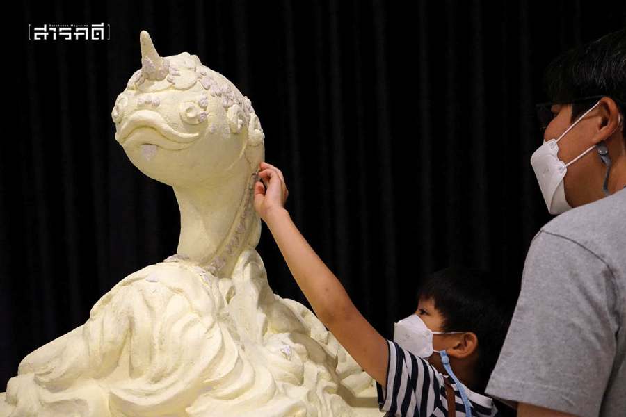 ผ่านจากยุคศิลปะโบราณสู่การทำให้ร่วมสมัย งานศิลป์ไทยในยุคนี้รับอิทธิพลจากศิลปะตะวันตก มาปรับรูปแบบ แนวคิด หรือเนื้อหาที่สอดรับกับบริบทของไทย รวมถึงเปลี่ยนจุดมุ่งหมายจากเดิมที่มีไว้เพื่อรับใช้เพียงชนชั้นสูงและศาสนา เป็นการสร้างสรรค์มาเพื่อแสดงความรู้สึกแทน พบเห็นประติมากรรมสัตว์หิมพานต์ชื่อ “ศฤงคมัสยา” ปลาในตำนานที่กล่าวกันว่าเป็นร่างอวตารของพระวิษณุ นำมาปั้นใหม่ให้ร่วมสมัย ตัดลายไทยมากมายออกไปคงไว้เพียงลักษณะเด่น เพราะอยากให้คนที่มาได้ลองเล่น “กระแหนะลาย” วิธีการแสนง่ายไม่ซับซ้อนโดยใช้ดินปั้นที่เตรียมไว้ให้กดลงในแม่พิมพ์ เกิดเป็นดินลวดลายไทยรูปร่างคล้ายเกล็ดปลา เอาไปติดที่ตัวศฤงคมัสยาจุดไหนก็ได้ตามจินตนาการ ข้างๆ ยังมีให้ลองประดับกระจก “ดอกพุดตาน” ลายไทยในหมวดพรรณพฤกษาที่ชินตากันในงานศิลปะไทย เอามาทำใหม่เป็นดอกไม้ขนาดใหญ่สีสันดูน่ารัก มีพื้นที่ว่างให้ได้ช่วยกันติดประดับกระจกแผ่นเล็กๆ เด็กๆ ชื่นชอบ