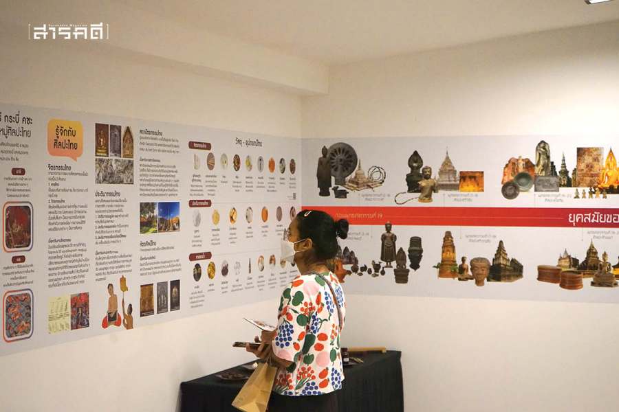 อ่านป้ายให้พอรู้ก่อนไปหยุดดูโต๊ะจัดแสดงวัสดุอุปกรณ์ที่ศิลปินไทยยุคโบราณใช้สรรค์สร้างงานวิจิตร หลายอย่างเป็นของธรรมชาติที่หาง่ายแต่หลายคนไม่รู้ว่ามีประโยชน์ทางศิลป์ ตั้งไว้ให้ลองมาหยิบจับได้ทุกชิ้น เช่น พู่กันจากขนหูวัวหรือหนวดหนู แปรงรากลำเจียกที่ใช้ทำภาพพุ่มไม้ หรือสีฝุ่นที่ได้จากธรรมชาติ เห็นภาพรวมศิลปะไทยยุคแรกเริ่ม