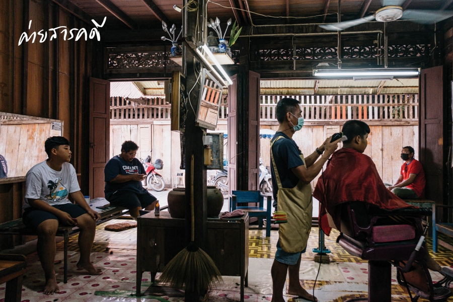 “มาถึงก็มาตัดผม แรก ๆ คนเยอะ รู้จักกันหมด พวกบ่อกุ้งมีแต่คนต่างจังหวัดทั้งนั้น แถวนี้บ่อกุ้งเต็มหมด ฝั่งโน่นก็มี ฝั่งนี้ก็มี หนังมีทุกคืน เห็นมั้ยเมื่อเช้าที่เดินไป ตรงวิกเก่าเลิกไปนานละนะ ทำโดมแทน แต่เลยร้านก๋วยเตี๋ยวไปจะเป็นอีกวิก ฉายทุกคืน สองเรื่องสิบบาท” โด่ง ชายผู้ชำนาญการตัดผมพูดไปพลางตัดผมลูกค้าไปด้วย