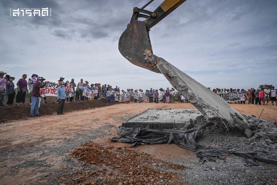 รถแบคโฮเริ่มทุบรื้อถอนฐานคอนกรีตเป็นชิ้นเล็กชิ้นน้อย ก่อนรถแทรกเตอร์ชักลากเศษซากฐานขุดเจาะสำรวจออกไปจากพื้นที่ ท่ามกลางเสียงไชโยโห่ร้องแสดงความดีใจ
