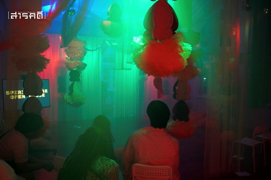 “Spirit House Open House Happening Now” ข้อความบนป้ายจอดิจิทัลบอกผู้เยี่ยมชมว่านิทรรศการกำลังดำเนินขึ้น เรากระชับสายสะพายกระเป๋าข้างตัวไว้แน่น รู้สึกตื่นเต้นตั้งแต่ก้าวลงจากรถ เดิมทีแสงสีที่อาบอาคารหลังนี้ไว้นั้นก็น่าดูชมแล้ว ประสบการณ์ที่จะได้รับวันนี้คงน่าสนใจไม่เบา