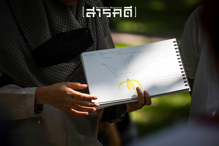 จากนั้น ครูกุ้งชวนบันทึกดอกไม้ที่ชอบแล้วนึกถึงความเชื่อมโยงกับตัวเรา ไม่ว่าจะสิ่งที่นึกถึง ประสบการณ์ในวัยเด็ก เป็นต้น จากนั้นชวนกันไปบันทึกใบไม้ หาความแตกต่างและรายละเอียดที่ไม่เหมือนกัน ครูกุ้งเน้นย้ำว่าอย่าลืมเขียนคำบรรยายลงไปด้วย วันนี้เราไม่ลืม แต่วันหน้าเราอาจจะลืมก็ได้ ดังนั้นต้องฝึกนิสัยนักบันทึกเอาไว้