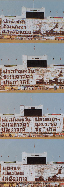 พอถึงวันที่ ๒๙ มกราคม พ.ศ.๒๕๒๖ งานฟุตบอลประเพณีจุฬาฯ-ธรรมศาสตร์ครั้งที่ ๓๙ เริ่มขึ้น ณ สนามศุภชลาศัย เราวางแผนเตี๊ยมกับทางโฆษกสนาม ขณะที่ขบวนพาเหรดล้อการเมืองเข้าสู่สนามได้สักพัก พอได้เวลาถ่ายทอดสดเราก็วิทยุไปยังโฆษกบอกผู้ชมให้ตั้งใจดูหน้าสแตนด์เชียร์ธรรมศาสตร์เพราะจะได้พบปรากฏการณ์ครั้งแรกและให้กล้องโทรทัศน์เตรียมจับภาพ บนอัฒจันทร์เริ่มแปรอักษรเป็นคำกลอนพร้อมกับที่โฆษกสนามอ่านกลอนบทนี้ดังก้องสนามศุภชลาศัย ปิดท้ายด้วยภาพอาจารย์ปรีดี พนมยงค์ มีฉากหลังเป็นรูปโดม สัญลักษณ์ของ ม.ธรรมศาสตร์ ท่าพระจันทร์